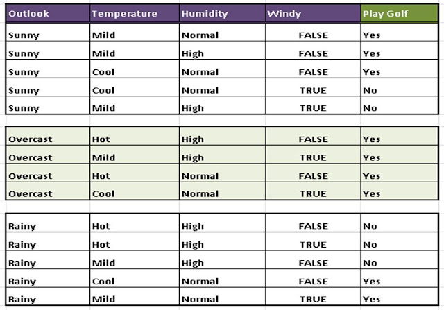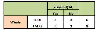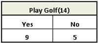 This formula may look unfriendly, but it is quite clear. The easiest way to approach this calculation is to create a frequency table for the two variables, that is PlayGolf and Outlook.