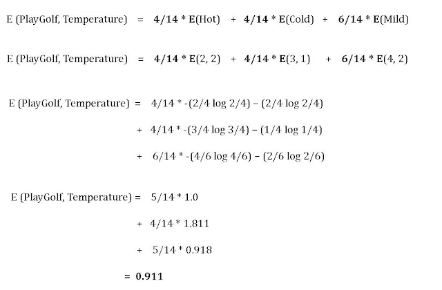 Gain(PlayGolf, Temperature) = Entropy(PlayGolf) – Entropy(PlayGolf, Temparature)