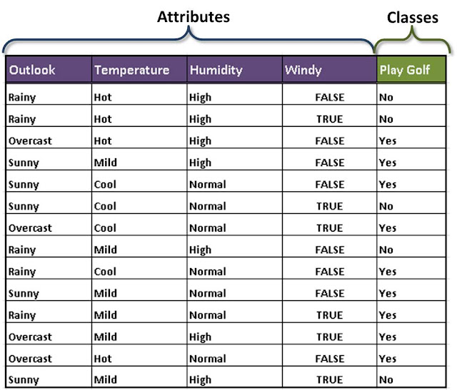 In this case, it it the last column, that is Play Golf column with classes Yes and No.
