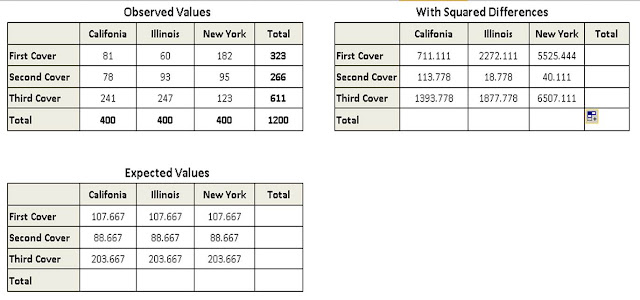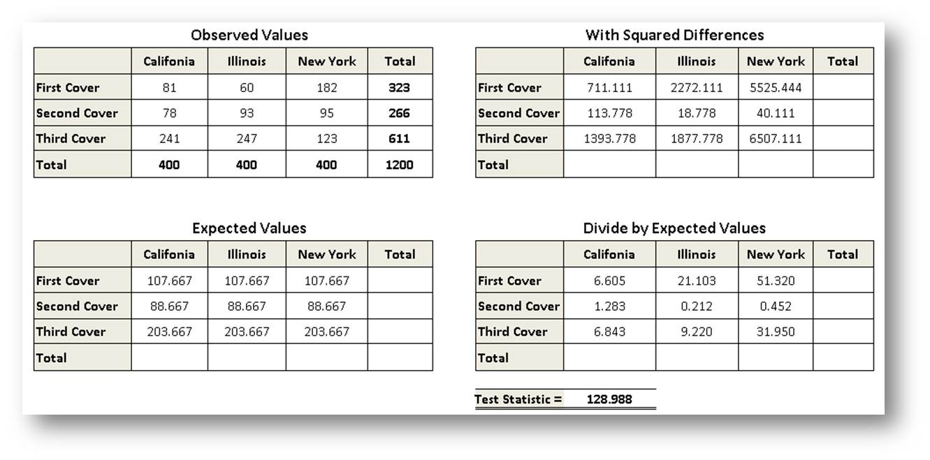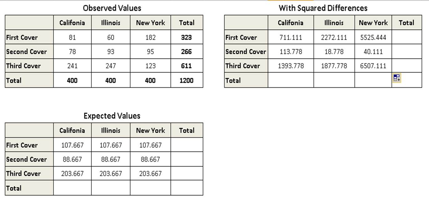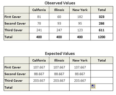A publisher is interested in determing whinf of three book cover is most attractive. He interviews 400 people in each of the three states (Califonia, Illinois and New York), and asks each person which of the cover he or she prefers. The number of preference for each cover is as follows: