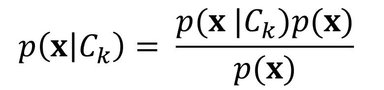 We could assign it to any of the two classes, C1 or C2 (let’s use Ck, for k = {1,2}). We need to find the probabilities of the two classes given the image. This probability is given by p(Ck | x). Using Bayes theorem, these probabilities can be expressed in the form: