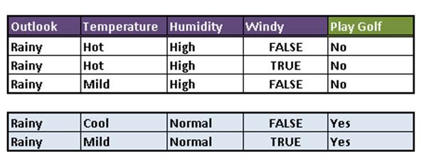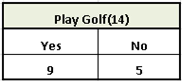 This formula may look unfriendly, but it is quite clear. The easiest way to approach this calculation is to create a frequency table for the two variables, that is PlayGolf and Outlook.