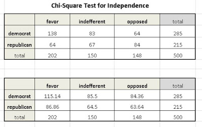 For example, in the first cell under the favor column and in the democrat row, the expected value would be given as: