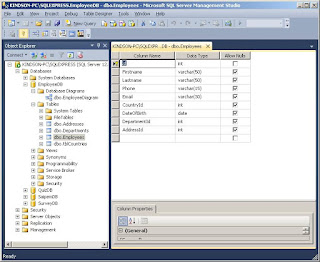 Employees Table: This table would be the master table that holds the records of all the employees. The Employees table is related to the other Departments table, the Countries table and the Addresses table throught the DepartmentId field, the CountryId field and the AddressId field respectively.