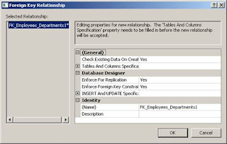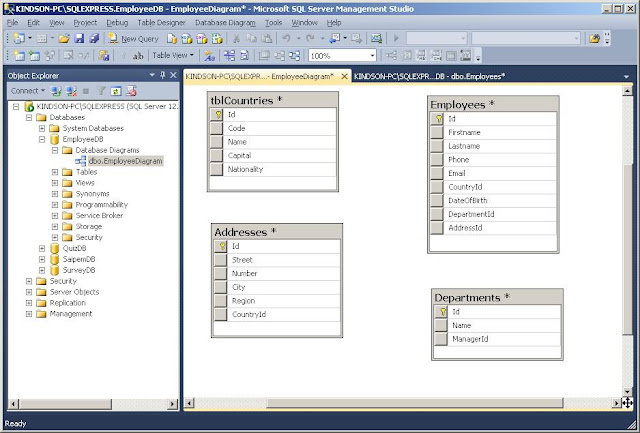 For example, to create a relationship between the Employees table and the Departments table, drag the Id from the Departments table and place it on the DepartmentId in the Employee Table