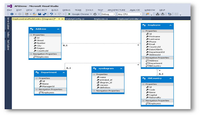 - Navigation Properties: This is additional information that could be selected along with the given record. For instance, for an Employee, we need to select his address, country and department. Note that they have singular name. In other tables like Departments, the navigation properties specifies the Employees that belong to a particular department. Also note that the navigation property here is plural reflecting the one-to-many relationship(one department to many employees). This would become clearer as we progress