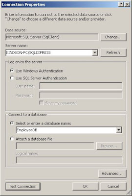 Now we need to connect to the database we created by specifying the name of the server, the instance and the name of the database.