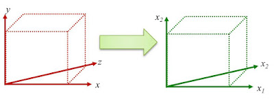 We would represent the coordinate system using variable and subscripts. For example, the two dimiensional axes would be x1, x2 axis and not x, y. Similarly the 3 dimensional axis would be x1, x2, x3 axis and not x, y z.