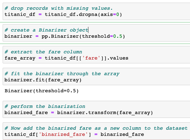 For example, in our Titanic dataset, we can binarize the fare field following the steps below: