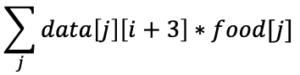 since the amount of to be spent on food j is food[j], therefore, the amount of nutrient provided by food j is data[j][i+3] * food[j]