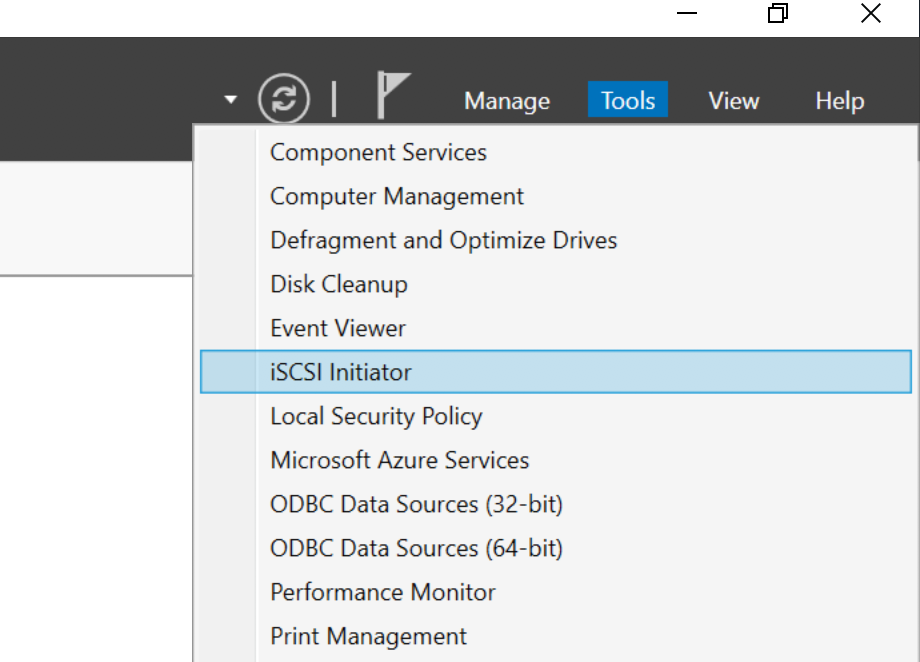 Step 1 – Log in to Node1. Click on tools on the upper right and select iSCSI initiator as shown below: