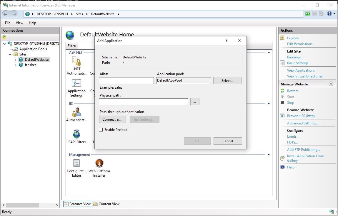 Right-click on the DefaultWebsite and choose ‘Add Application’