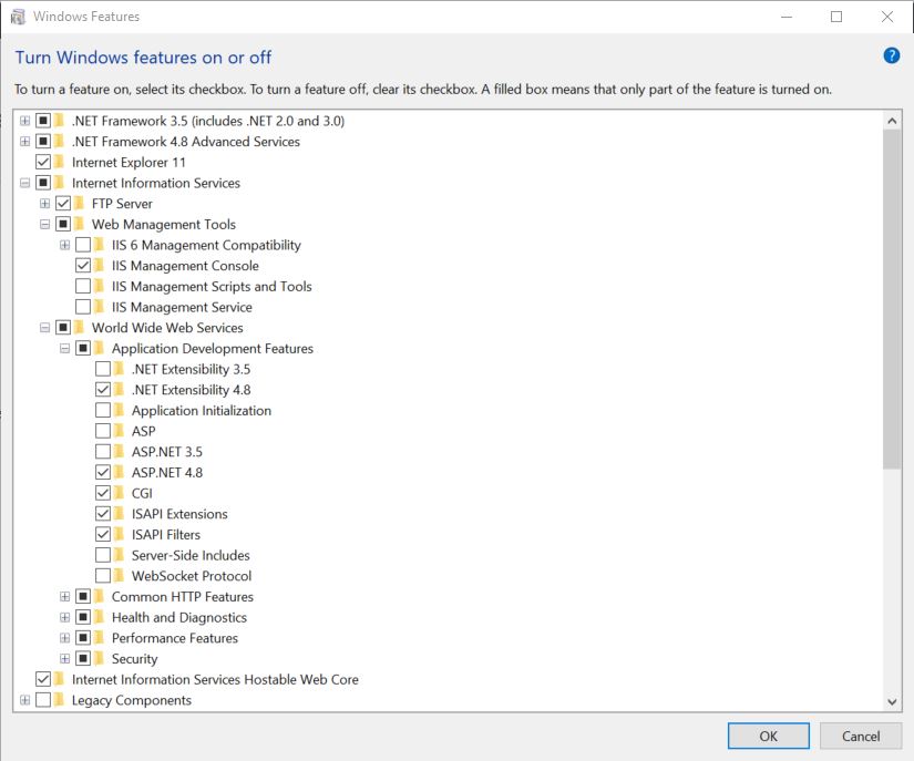 - Make sure IIS and other features are selected as shown below