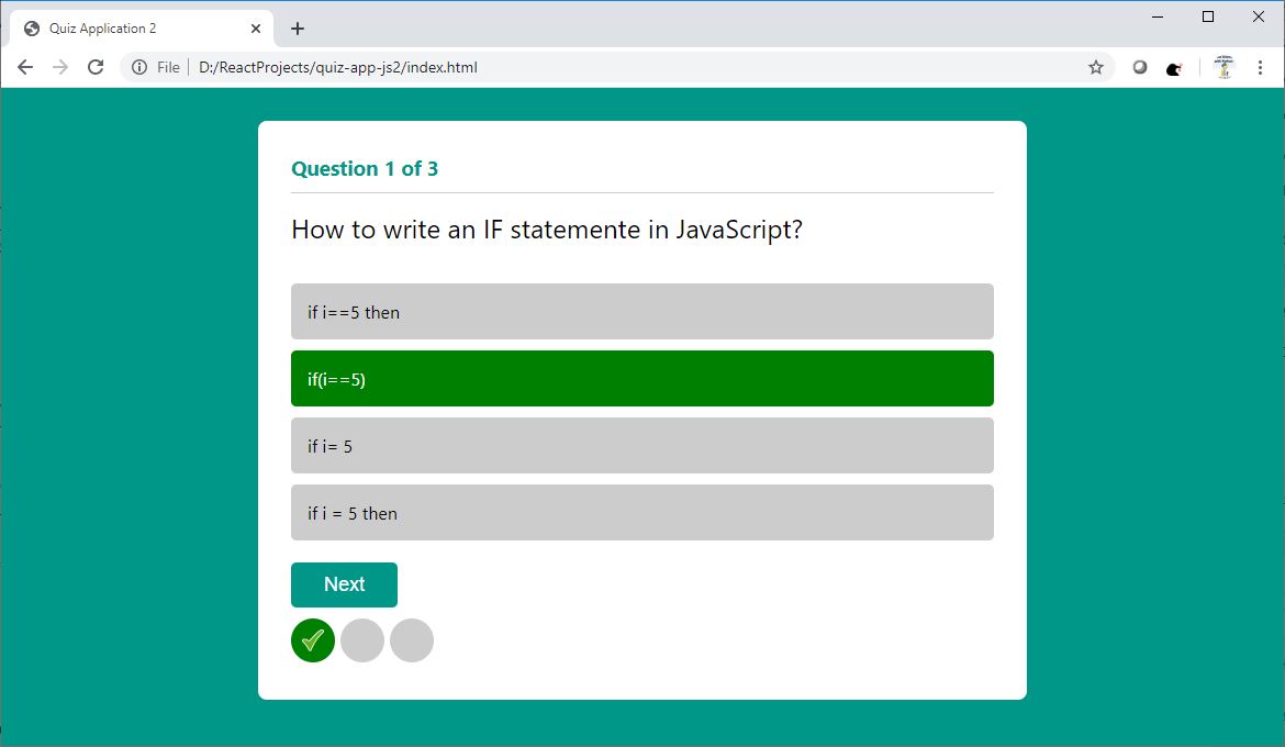 This function check if an option selected by the user is the correct option. Take a look at the code below and then we’ll discuss it.