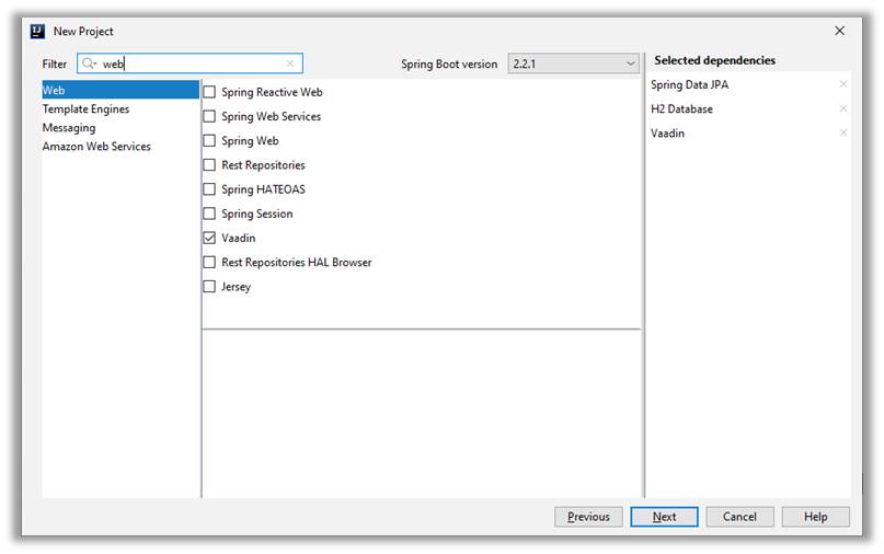 Vaadin, H2 and Jpa. The screenshot is shown below. We’ll add more dependencies using the pom.xml file