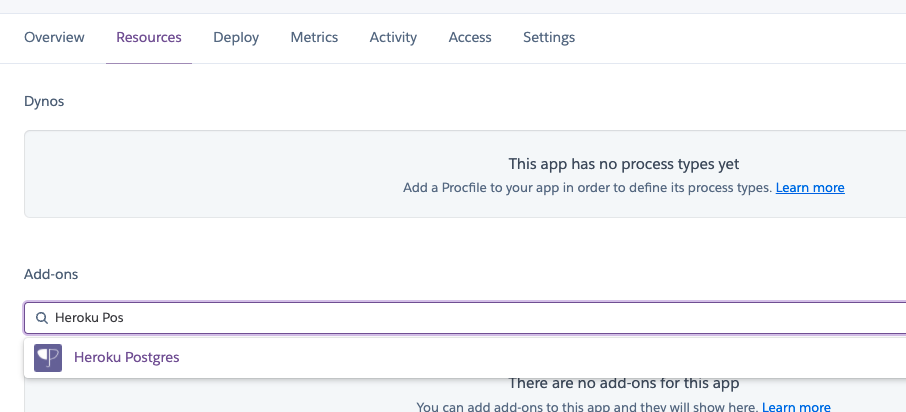 Step 3 – Under the Resources section, find Heroku Postgres in the Add-ons section